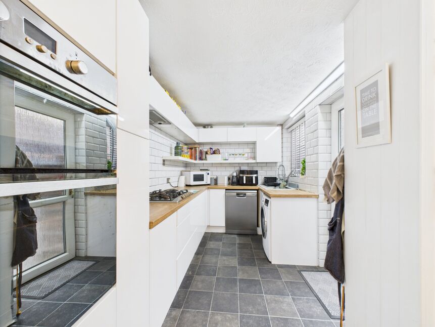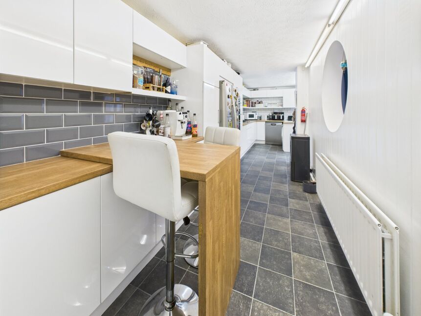 modern fitted wall and floor units with wood effect work surface, stainless steel sink unit and single drainer, integrated gas hob, electric oven and grill and extractor hood, plumbed for automatic washing machine, plumbed for dishwasher, space for fridge/freezer, breakfast bar area, part tiled walls, vinyl floor covering, double glazed window, external door
