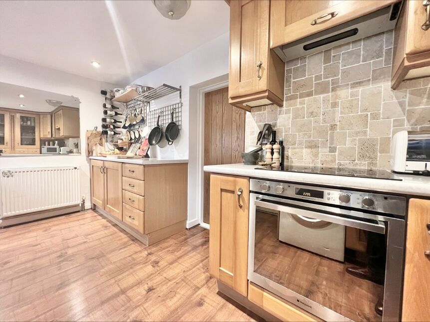 A fully fitted kitchen with an ample range of solid oak wall and base cabinets with contrasting works surfaces and ceramic splashback tiling.Integrated appliances include Induction ceramic hob with matching fan assisted oven, automatic washer/dryer, integrated automatic dishwasher and integrated separate fridge and freezer.Stainless steel sink and drainer with chrome mixer tap, neutral decor, oak effect laminate flooring and ceiling down spotlighting.