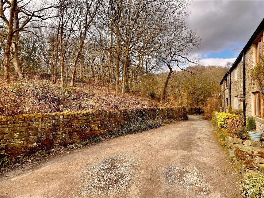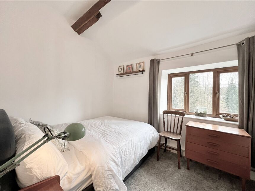 Externally, the property is located down a peaceful and charming country lane and has an adjacent car park with two allocated parking spaces which are arranged via a rental agreement. To the rear are tiered gardens with views of the woodland and stream and an abundance of countryside walks.