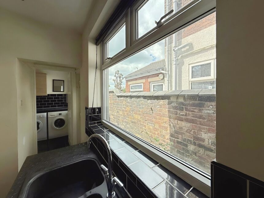 PVCu double glazed window and a PVCu frosted double glazed access door.Modern range of wall, drawer and base units with work surfaces that incorporate a one and a half bowl composite sink with mixer tap. Integrated electric oven, four ring gas hob and a stainless steel extractor hoodRadiator. Tiled flooring.