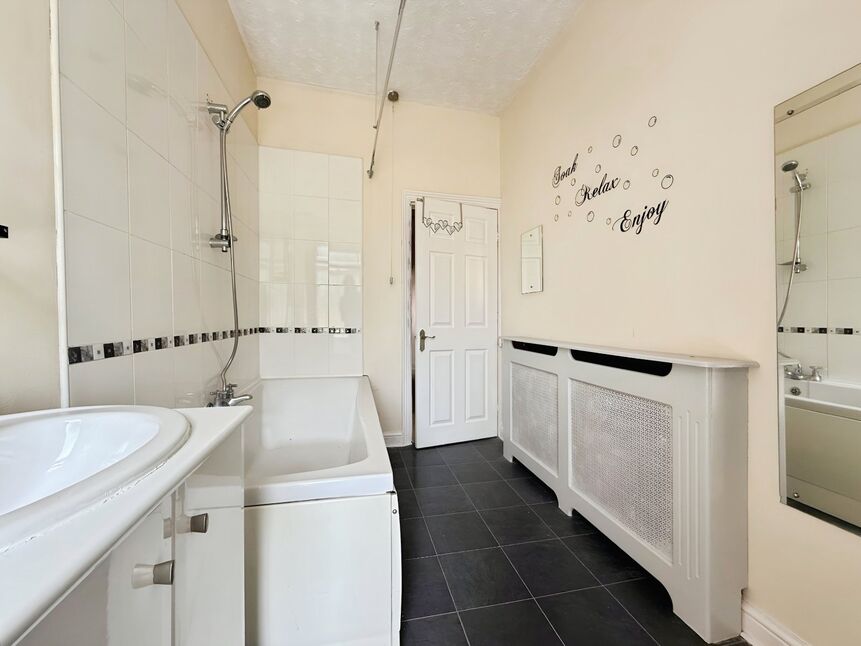 PVCu frosted double glazed window.Three piece white suite comprising of a close coupled WC, vanity basin and a panel bath.Radiator.Laminate tiled flooring.