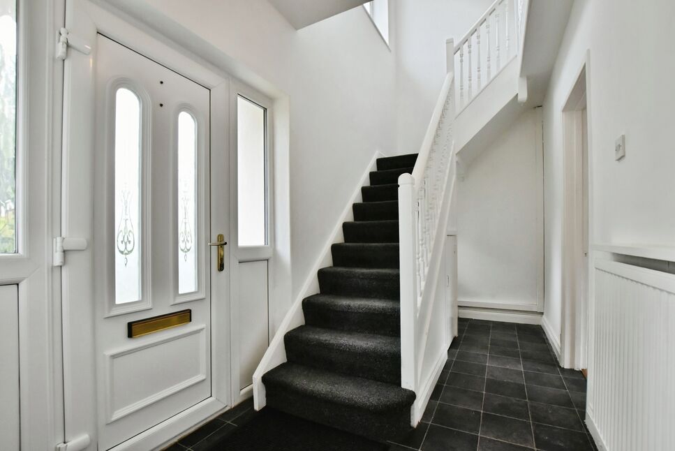 A uPVC front door with two uPVC double glazed windows either side leading you into the entrance hallway, radiator, understairs storage cupboard, a further uPVC double glazed window to the front and stairs leading you to the first floor.