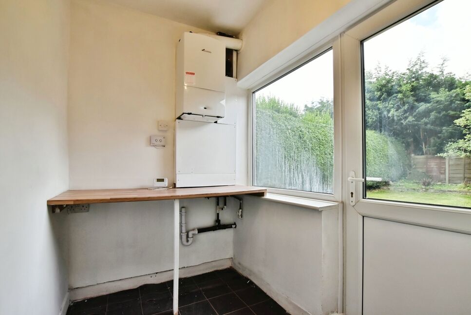 A built in work top provides space under for a washing machine and dryer, wall mounted boiler and a uPVC double glazed window.