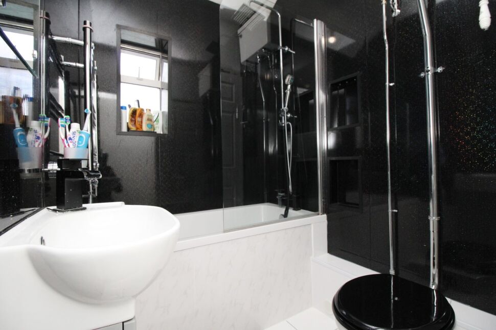 Being a modernised suite with a high flush W.C., vanity hand wash basin, bath with shower unit overhead, panelled walls, chrome heated towel rail, tiled flooring and a uPVC double glazed obscure window to the side.