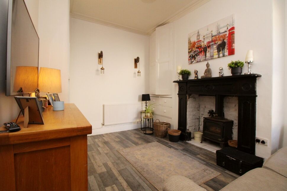 With feature cast iron multi fuel burner, radiator, power points, T.V. aerial point, storage cupboard and uPVC double glazed window to the rear and storage under the stairs.