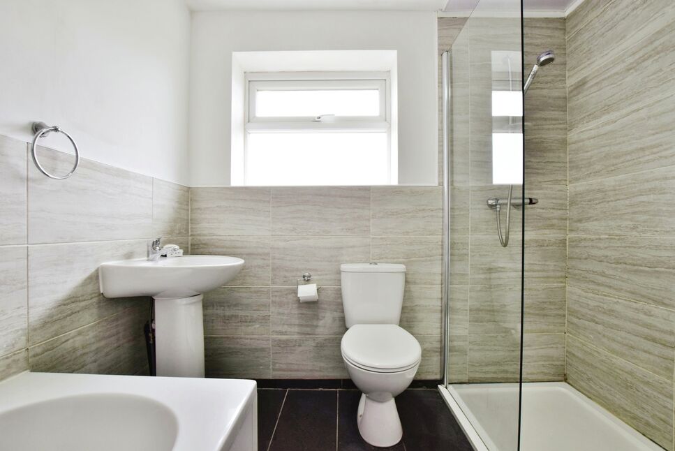 A modern shower room reveals a free standing shower unit, low level WC, pedestal wash hand basin, oversized part tiled walls, heated towel rail, tiled flooring and a double glazed uPVC window to the rear elevation.