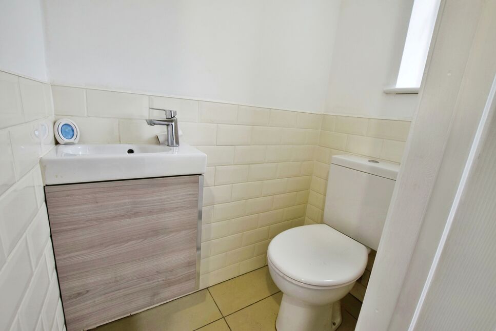 A low level WC, miniature square wash hand basin with storage, part tile walls, tiled flooring and a uPVC double glazed window to the rear elevation.