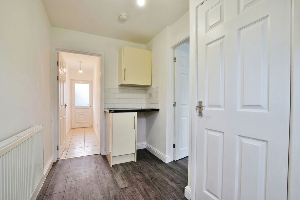 A perfect space for storage includes a wall cabinet with a base cabinetry and work surface over, part tiled walls, radiator, wall mounted combination boiler and uPVC door leading to the rear garden.