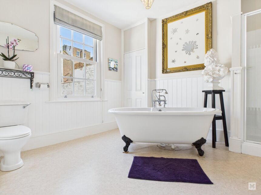 Double glazed sash window to the rear with Roman blind, freestanding roll top bath with traditional taps, shower cubicle, pedestal wash basin, low level WC, heated chrome towel rail plus a radiator, built in cupboard housing the Vaillant boiler, wall panels.