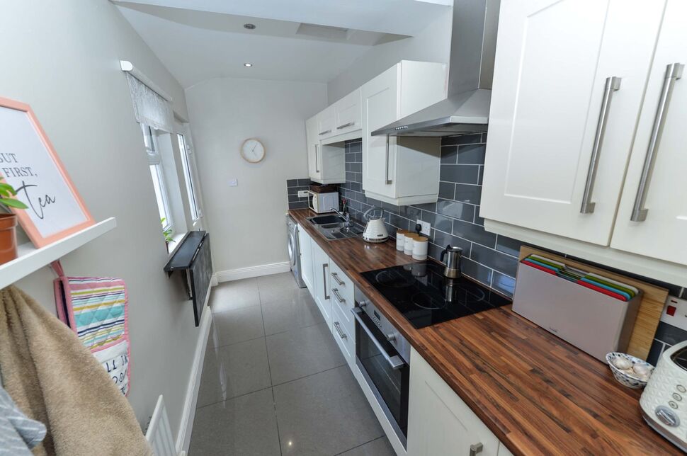 One bowl sink unit with chrome dual mixer tap. Excellent range of high and low level units with stainless steel door furniture and wood effect work surfaces. Integrated four ring electric hob and built in oven with chimney extractor hood. Plumbed for washing machine. Integrated fridge / freezer. Partly tiled walls. Ceramic tiled flooring. uPVC door to enclosed rear yard.