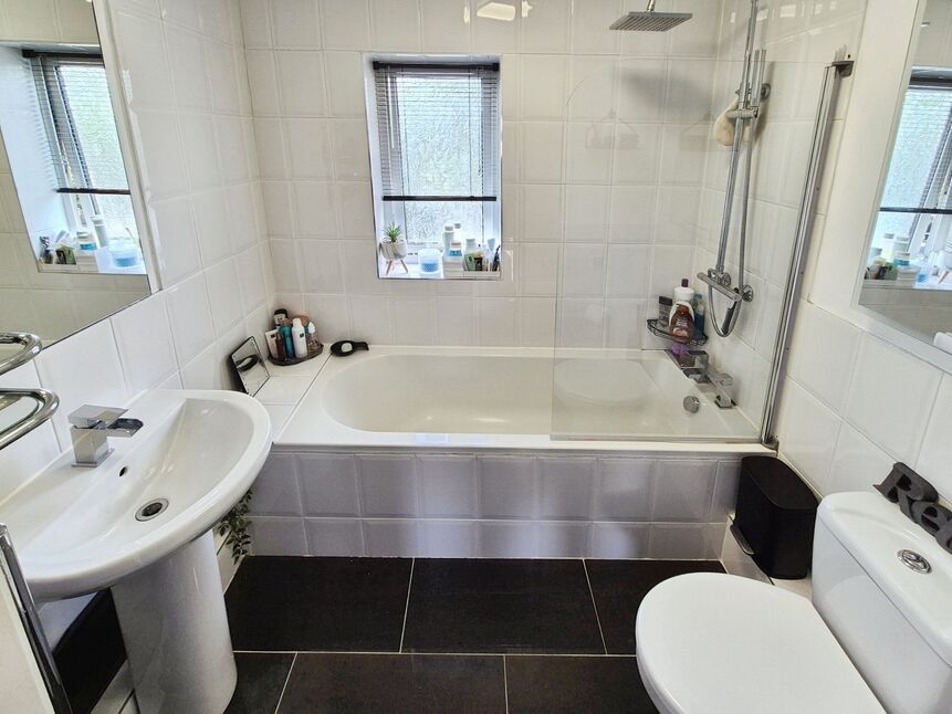 Fitted with a three piece complimentary suite comprising of panel enclosed bath with shower over, pedestal hand wash basin and a low flush w.c. Fully tiled walls and floor. Upvc frosted double glazed window to rear aspect. Ceiling light point.