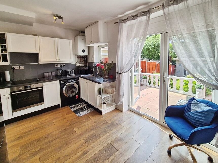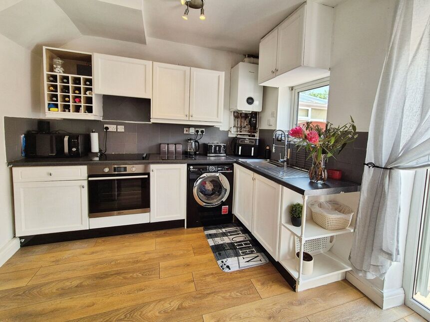 Fitted with a range of eye and base level units with complimentary work surface. Stainless steel sink and drainer unit. Plumbed for washing machine. Space for fridge freezer. Electric oven and four ring hob. Upvc double glazed windows and French doors to rear garden. Laminated wood flooring. Wall mounted gas combi boiler.