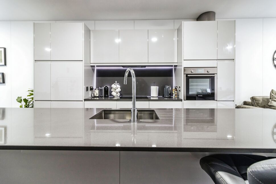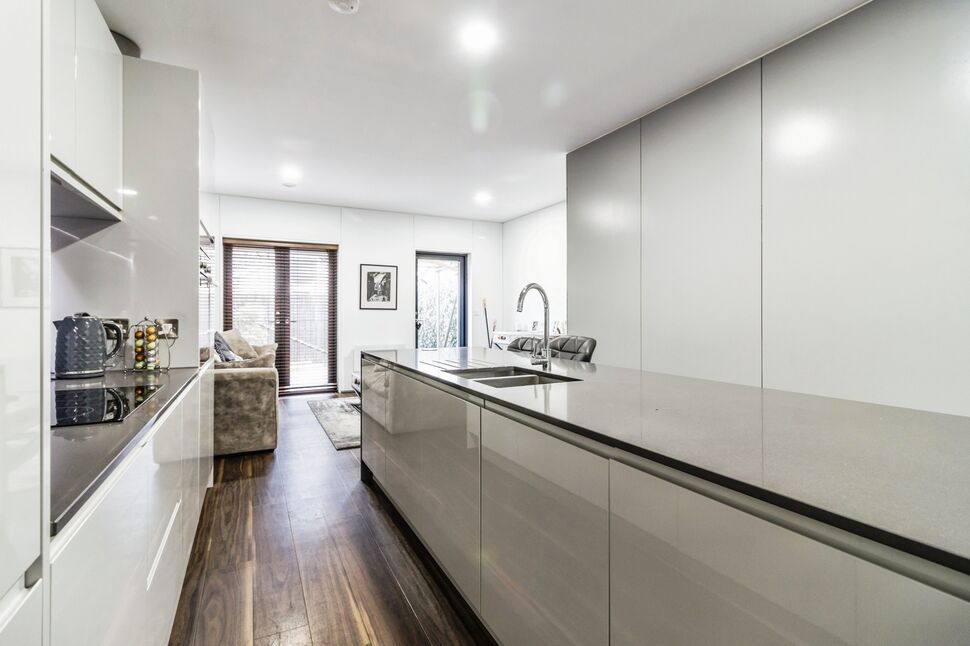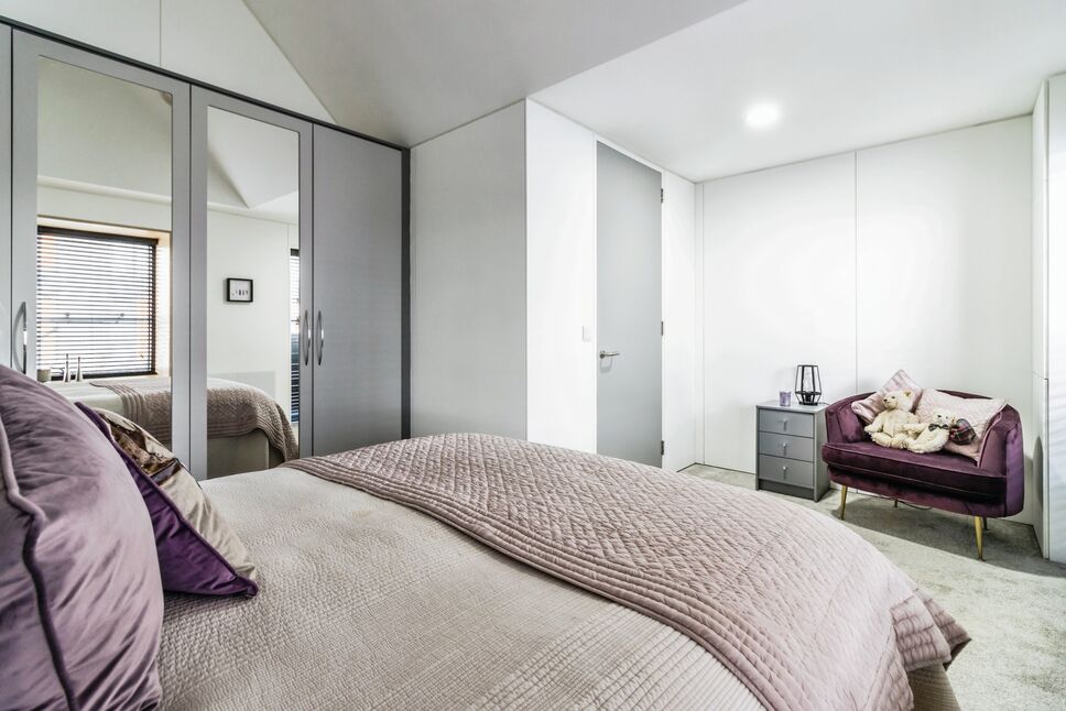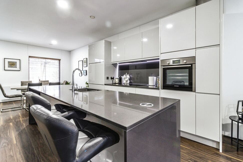 This vast open-plan space occupies the full ground floor of the property, and offers scope to be configured according to individual requirements to create living and dining zones with the impressive kitchen as the centrepiece. A window to the front elevation, along with French doors and a further glazed door to the rear garden, provide plenty of natural light. Attractive and practical wooden-style flooring and electric heating. The kitchen area features a range of fitted base and wall units, along with a large feature island incorporating a breakfast bar and inset sink with mixer tap. Range of integral appliances to include an electric oven and hob, fridge/freezer and dishwasher.