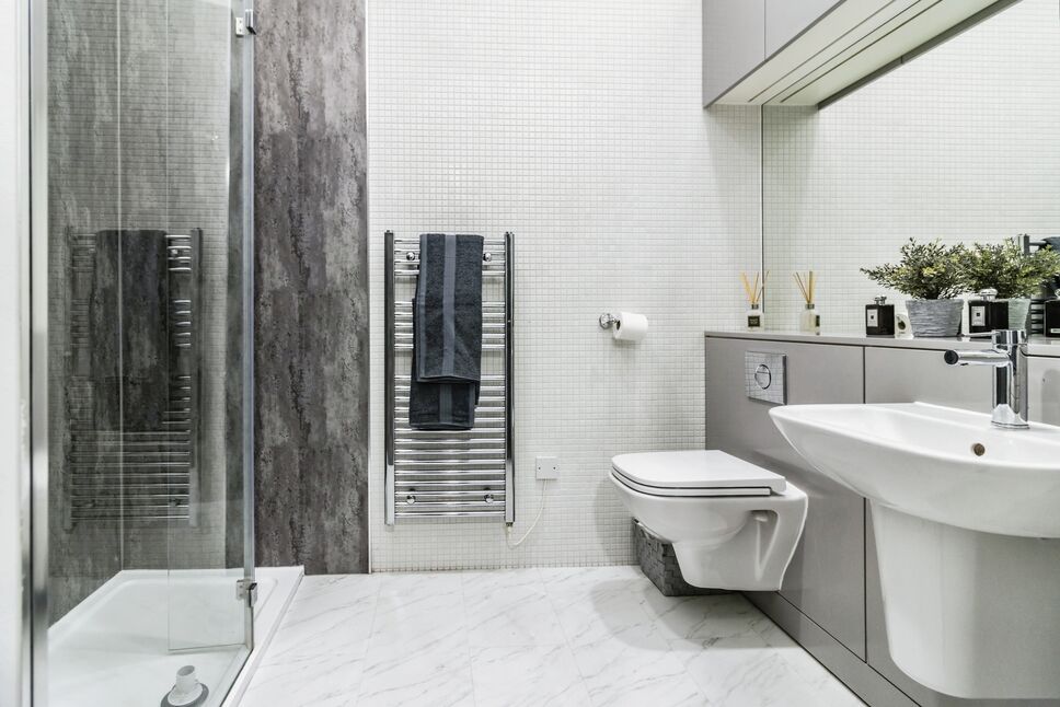 Luxuriously appointed with a large walk-in shower, wash basin with mixer tap, WC, tiled floor, heated towel rail.