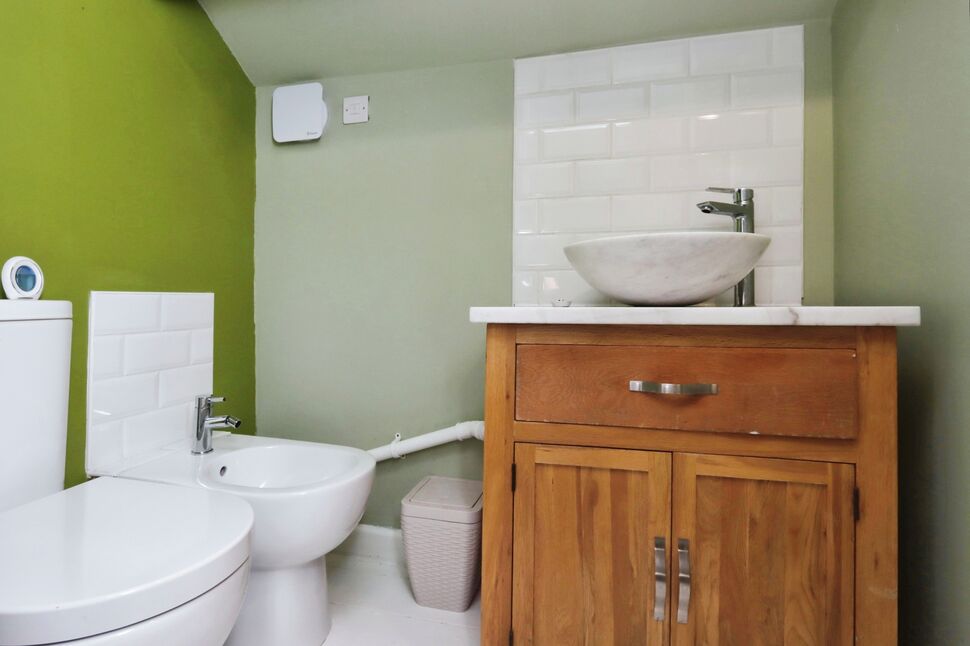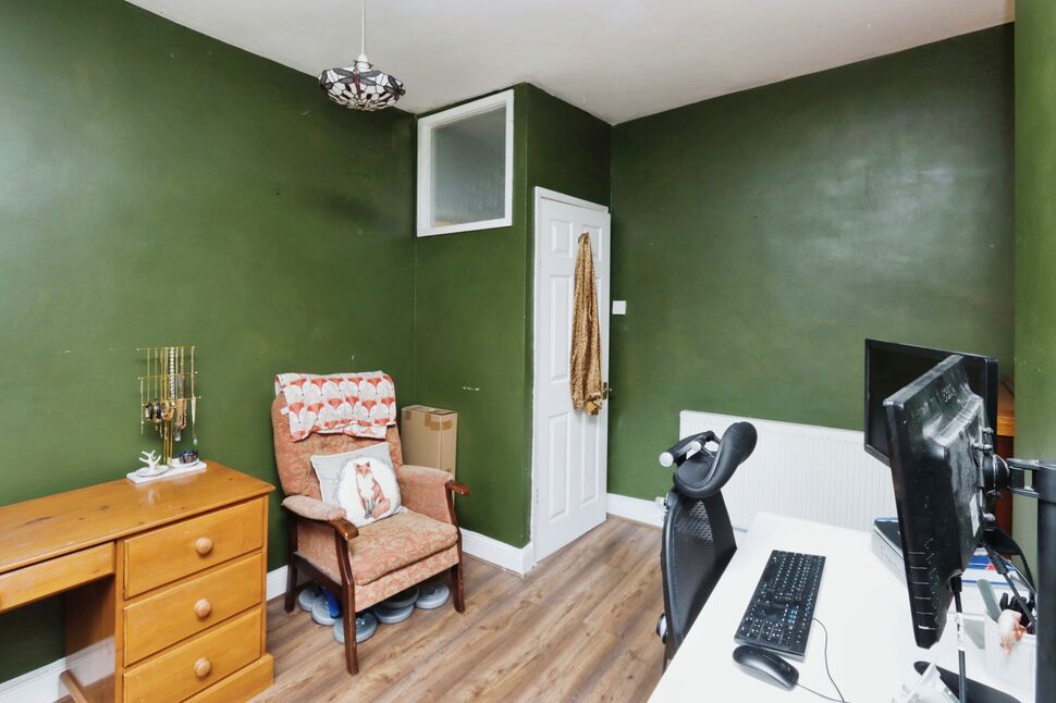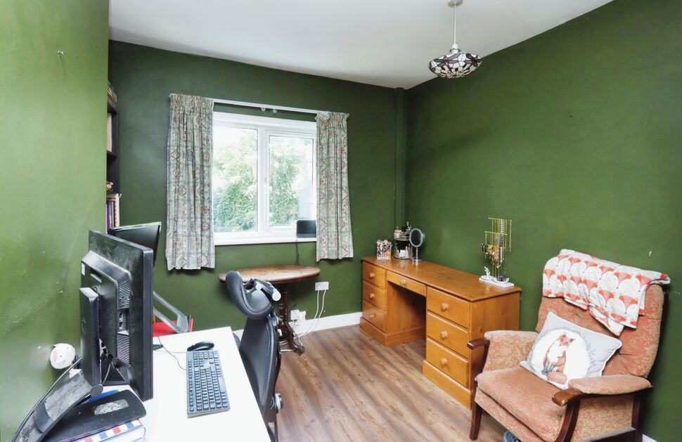 A comfortable double bedroom currently used as an office, but also ideal as a secondary spacious bedroom. Overlooks the garden below. Laminate flooring throughout.