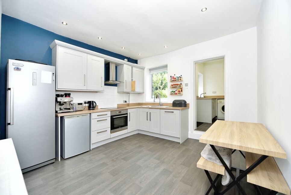 The well-appointed kitchen is bathed in natural light, featuring wall and base units, roll edge worktops, spotlights, and space for a dining table. The integrated oven and hob make it a cook's paradise!