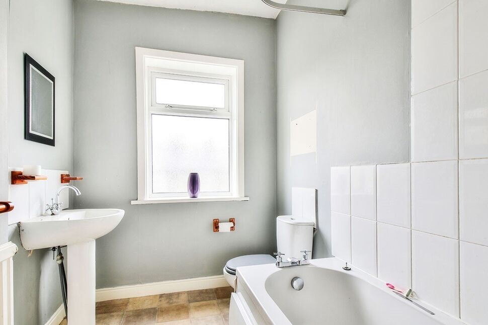 Three piece suite in white comprising of; panelled bath with shower over, pedestal wash hand basin, WC, Gas central heating radiator, Upvc double glazed window to the rear aspect.