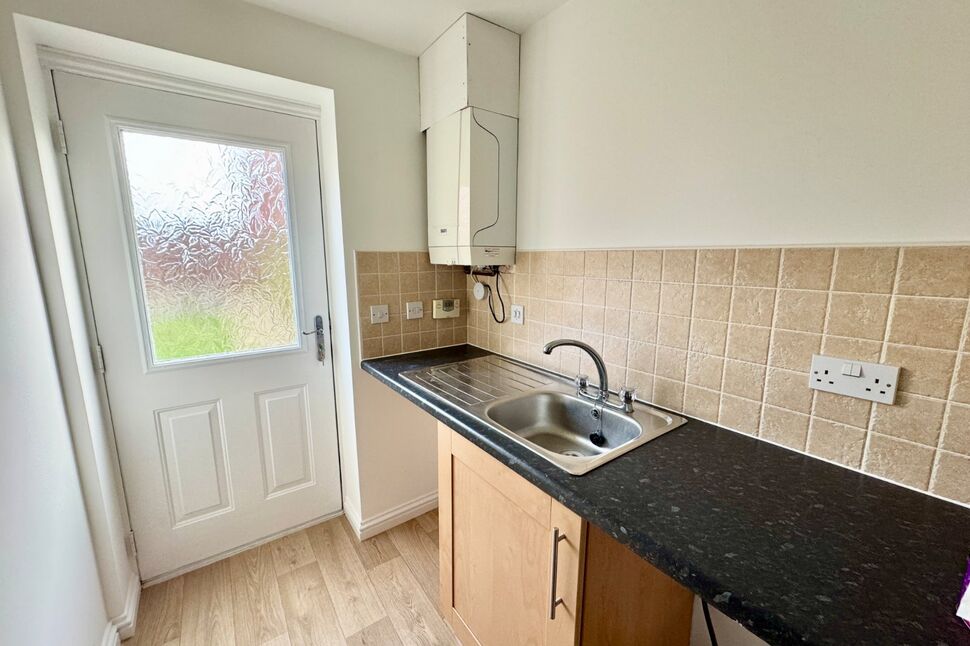 Accessed through the Garage, fitted with base unit with single drainer sink unit with mixer tap, recess for washing machine and tumble dryer, GCH boiler system, part tiled walls, fitted fridge freezer, door to the rear gardens.