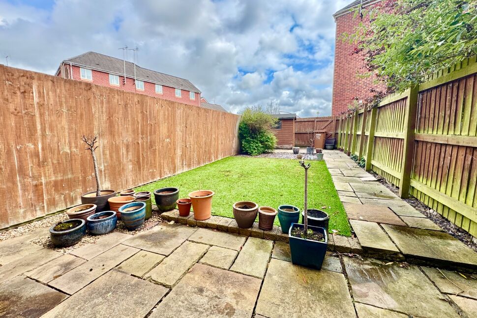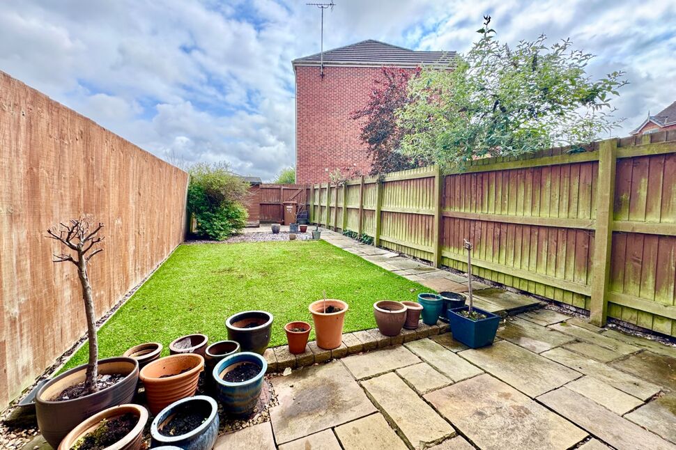 Patio area to the rear leads to the low maintenance gardens, with artificial grass area with fence borders, outside tap, gate giving rear access.
