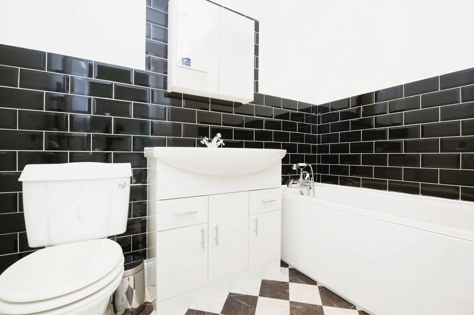 In the first bedroom. With a bath, toilet, and sink. Also featuring a heated towel rail and an extractor fan.
