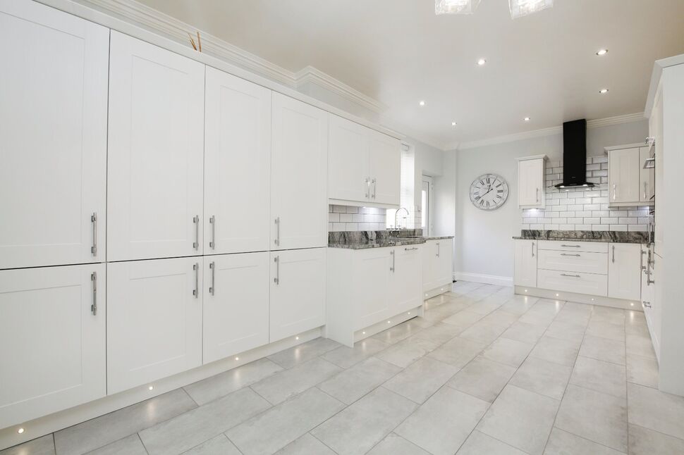 Fabulous modern kitchen with stone worktops and laminate units which house fully integrated units including the oven and induction hob, microwave, dishwasher, plumbed in washer and a fridge/freezer. With a double radiator, a window to the rear, rear access via UPVc door, and a storage cupboard under the stairs. With EvoCore Premium Flooring.