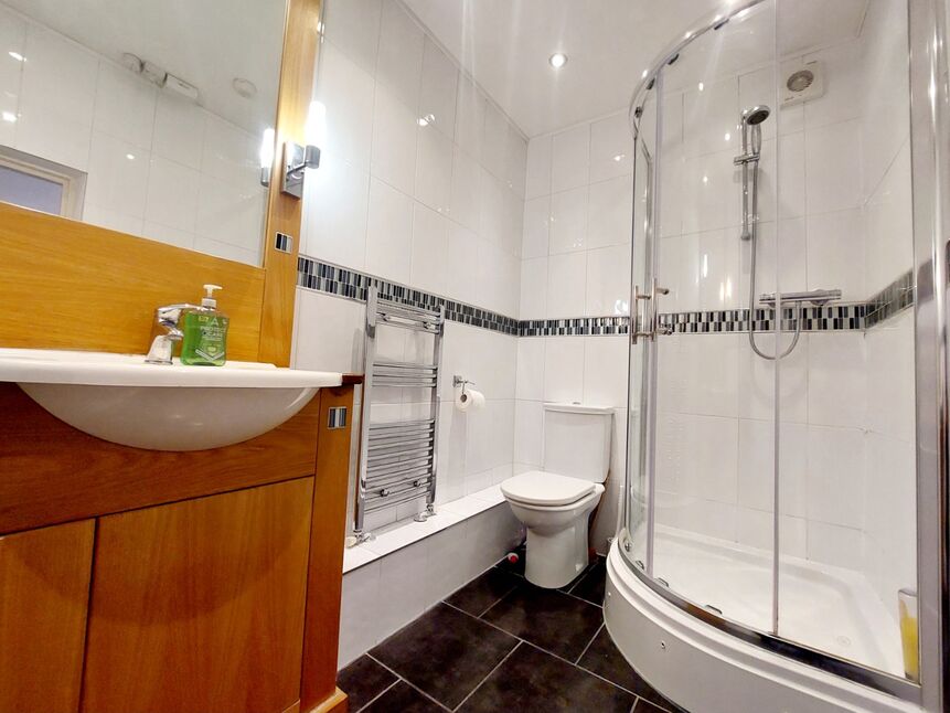 Carpeted double bedroom, currently used as an office, with a window to the rear, a built-in storage cupboard, and an en-suite featuring a walk-in shower, a toilet, and a sink. This room, along with the hallway and the annexe, make up the ground floor extension completed in the late 19th century.