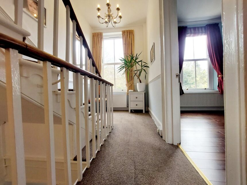 Tiered landing leading to hallway to the rear, accessing bedroom/office, drawing room, and first floor via staircase. With stunning period bannisters and handrails.