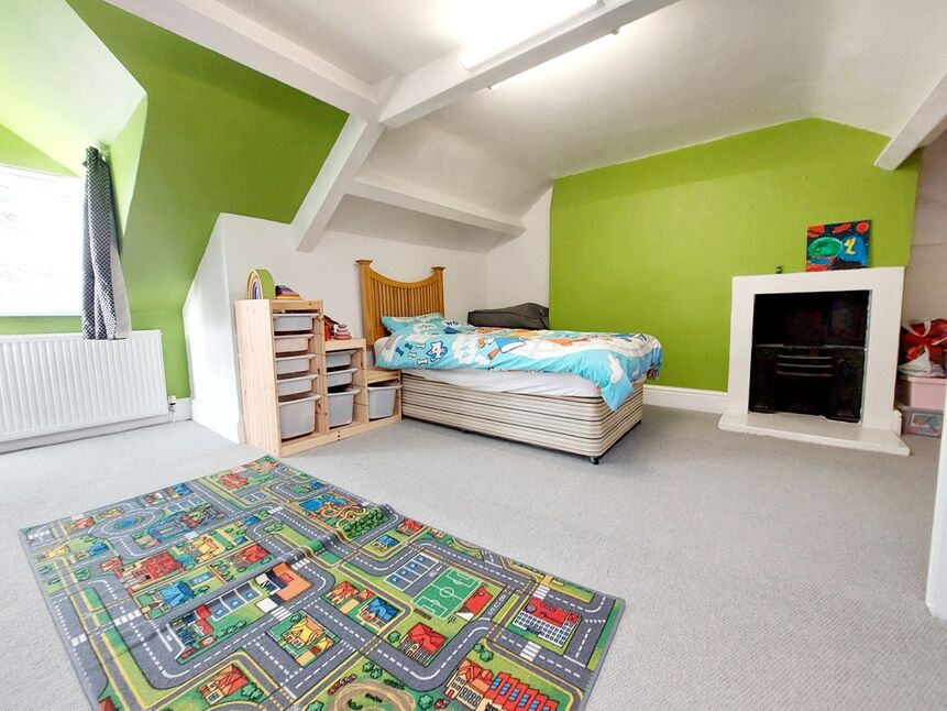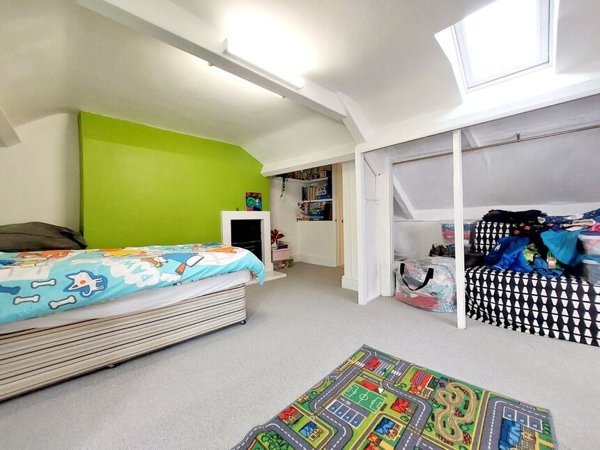 Carpeted double bedroom in the loft, with a dormer window to the front, a velux window to the rear, and a cast iron fireplace.