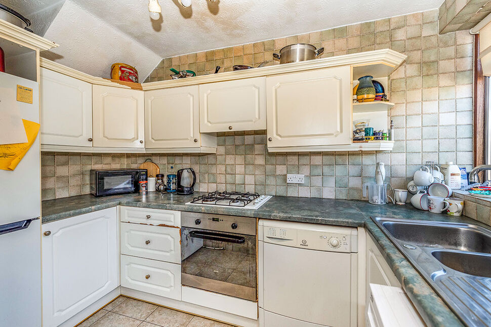 Tiled flooring, window to rear, a range of wall and base units, four ring hob, integrated oven, sink unit.