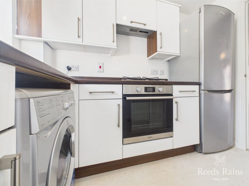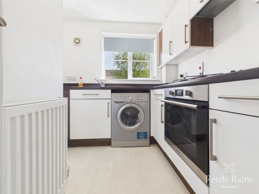 Laminate units and worktops house the integrated oven and allow space for kitchen items and appliances, with a window to the front.