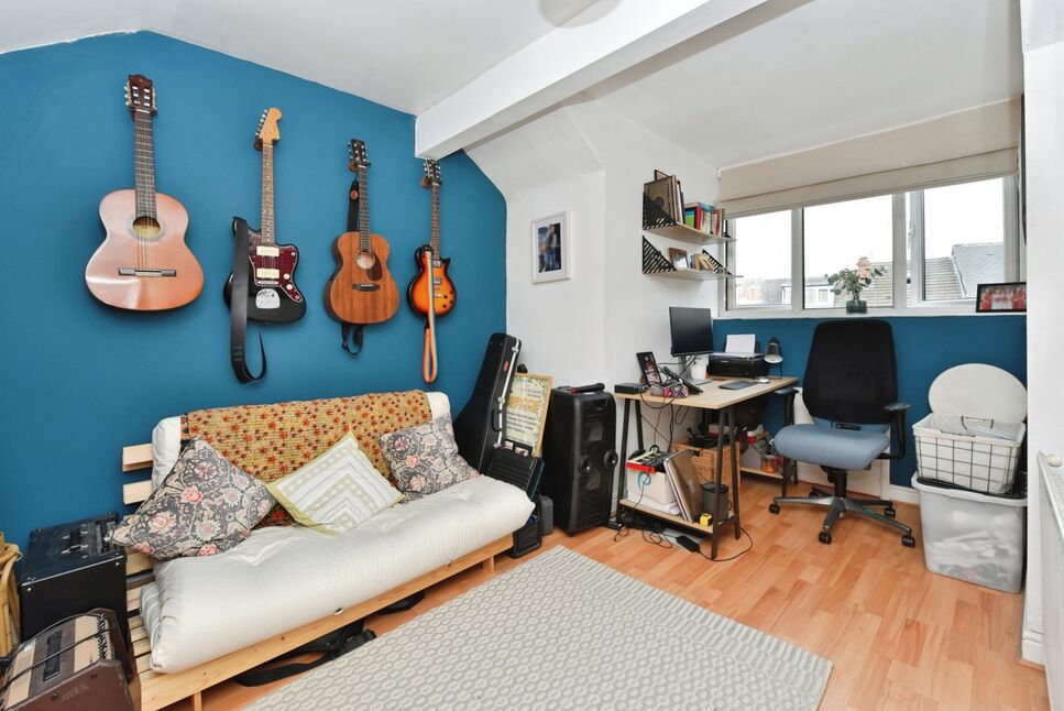 A glorious attic conversion double bedroom, beautifully decorated and laid with laminate flooring. Large dormer windows overlook the garden below, while a generously sized Velux faces the front, allowing light to stream from both sides.