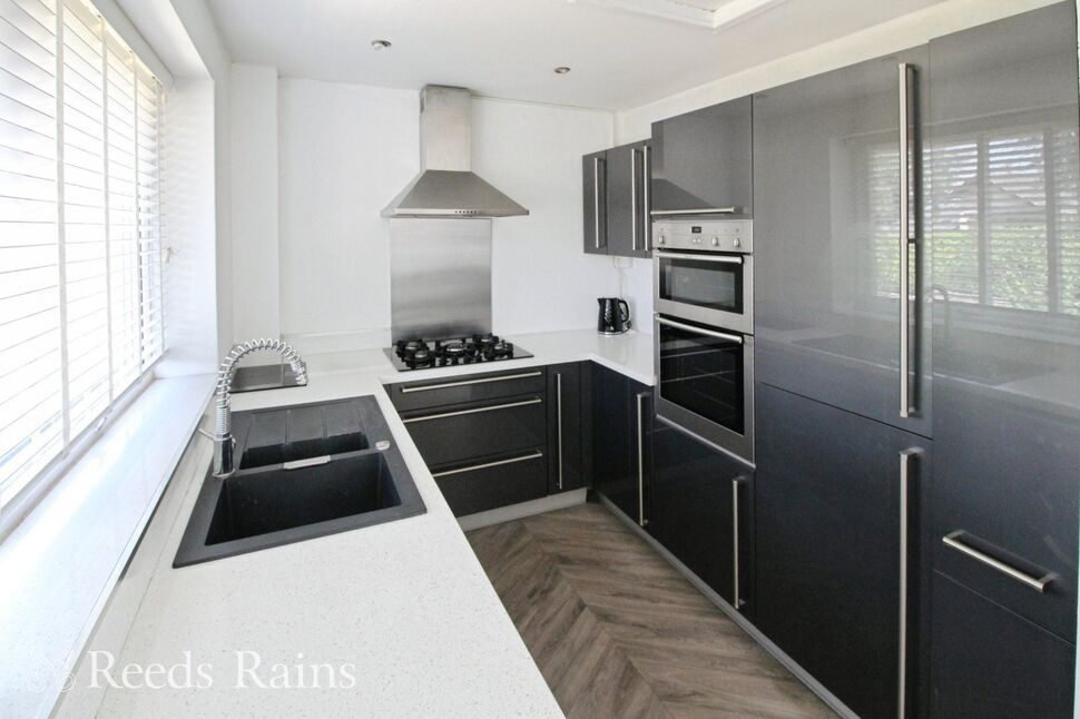 Fitted with a range of modern high gloss grey base, wall and drawer units. Frankie one and a half bowl sink unit with retractable rinsing tap. Neff oven and grill. Millar five ring gas hob. Stainless steel hood and stainless steel splashbacks. Built in wine fridge. Integrated fridge and freezer. Space for washing machine (washing machine included within the sale). UPVC double glazed window to the rear aspect. Loft access. Inset down lighting.