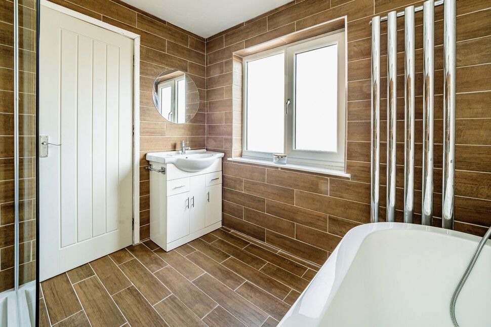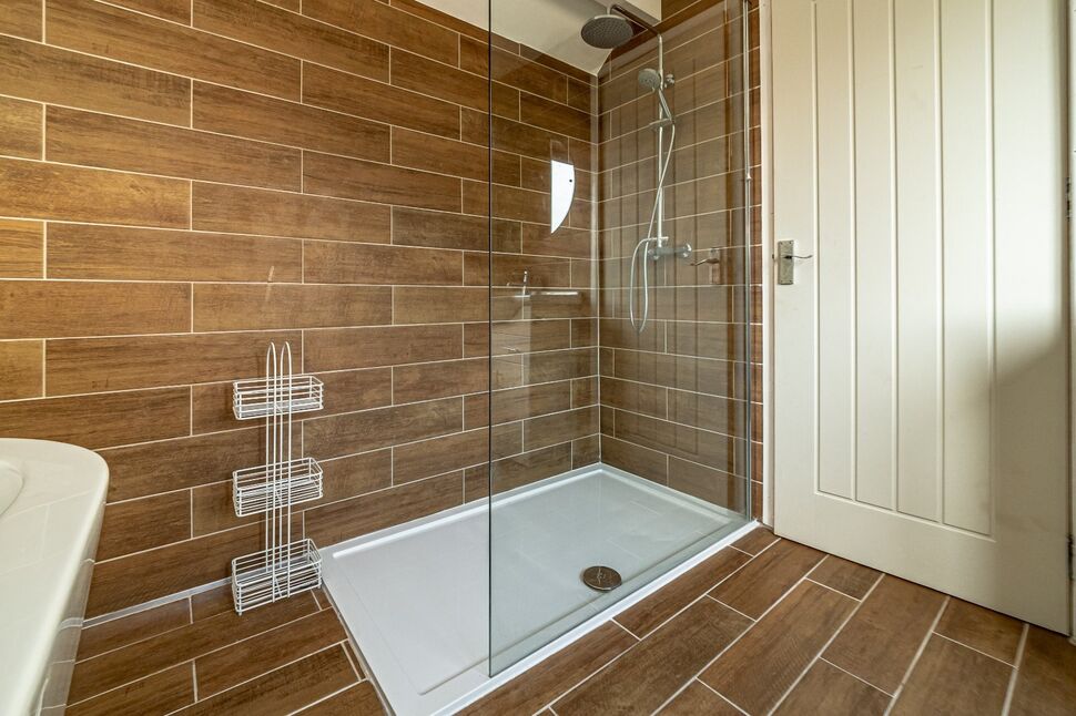 Steps lead down to a luxury bathroom area which offers tiling to both walls and floor. There is a separate W.C, which offers fully tiled walls, opaque UPVC window to the side, wall mounted gas central heating boiler, W.C and vanity hand wash basin. A further door leads into the bathroom which offers a deep fill freestanding bath with mixer tap and shower attachment over, vanity hand wash basin with ample storage under, good sized walk in shower cubicle with mains fed shower and opaque UPVC window to the side aspect.