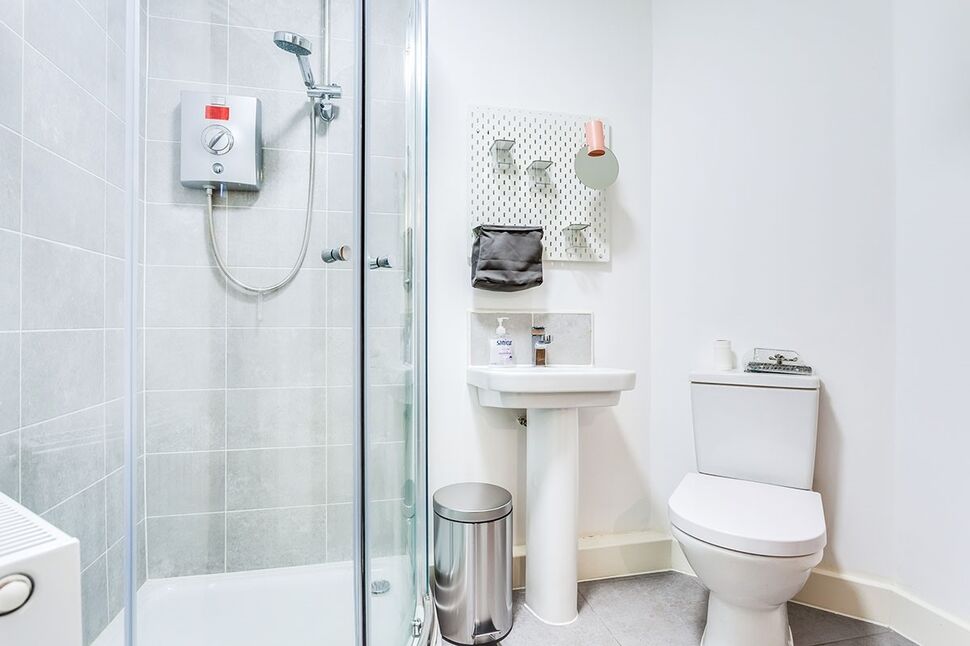 Modern shower room with shower cubicle, low flush WC and pedestal wash hand basin. Part tiled walls. Cupboard housing washer dryer.