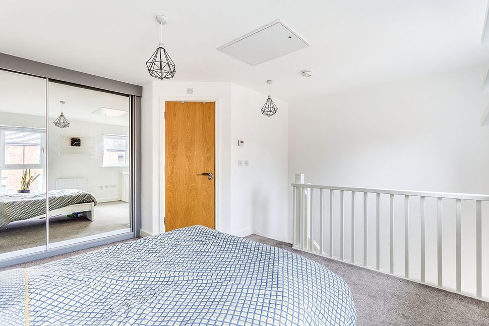 Double bedroom with wall to wall mirrored wardrobe providing ample storage. Neutral decor and carpet flooring. Two windows to front aspect. Furnished with double bed. Door leading to ensuite bathroom.