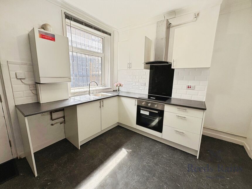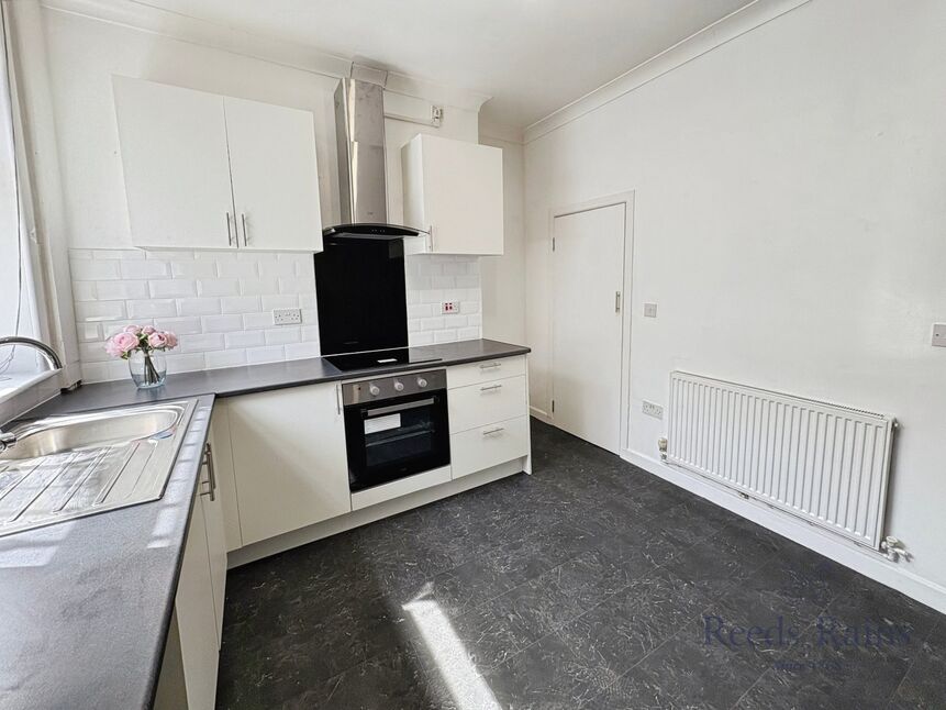 Stylish and modern kitchen, recently refurbished, boasting Upvc double glazed window to rear elevation, GSH radiator, vinyl flooring, range of wall and base units with contrasting surfaces, electric oven, hob and extractor, stainless steel sink, space for washer, spotlights, access to understairs storage