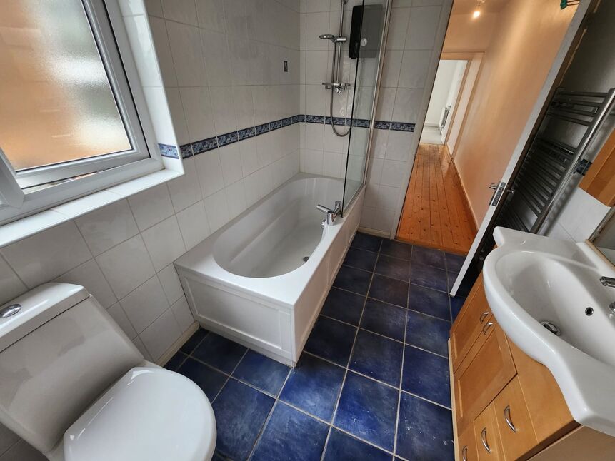 obscured single glazed window to the side, Bath with mixer tap and electric shower over, hand wash basin set in a vanity unit, close coupled ywca, radiator, tiled floor and walls.