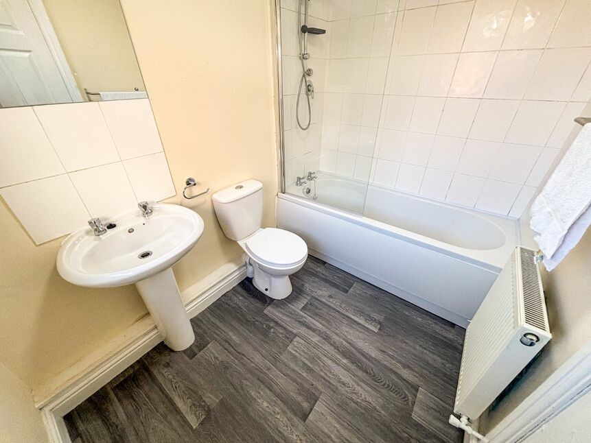 Internally, the accommodation is arranged over three levels. The ground floor comprises two bright and airy reception rooms offering excellent flexibility for living and dining purposes. Both rooms are neutrally decorated to a good standard, creating a light and welcoming feel throughout. The modern fitted kitchen is well-equipped and features a built-in cooker and hob, with ample storage and workspace. To the rear of the property is the ground floor bathroom, fitted with a white suite including a bath and shower over, providing a clean and modern finish.