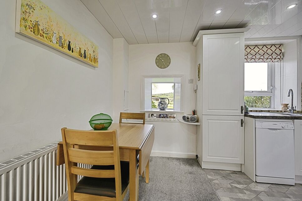 Providing fitted wall and base units, complementary work surfaces with an inset sink and drainer and tiled splash backs. Double electric oven, gas hob with an extractor fan over, plumbed for a washing machine and dishwasher and space for an under counter fridge and freezer. Two windows to the rear looking over the surrounding countryside. Dining Area