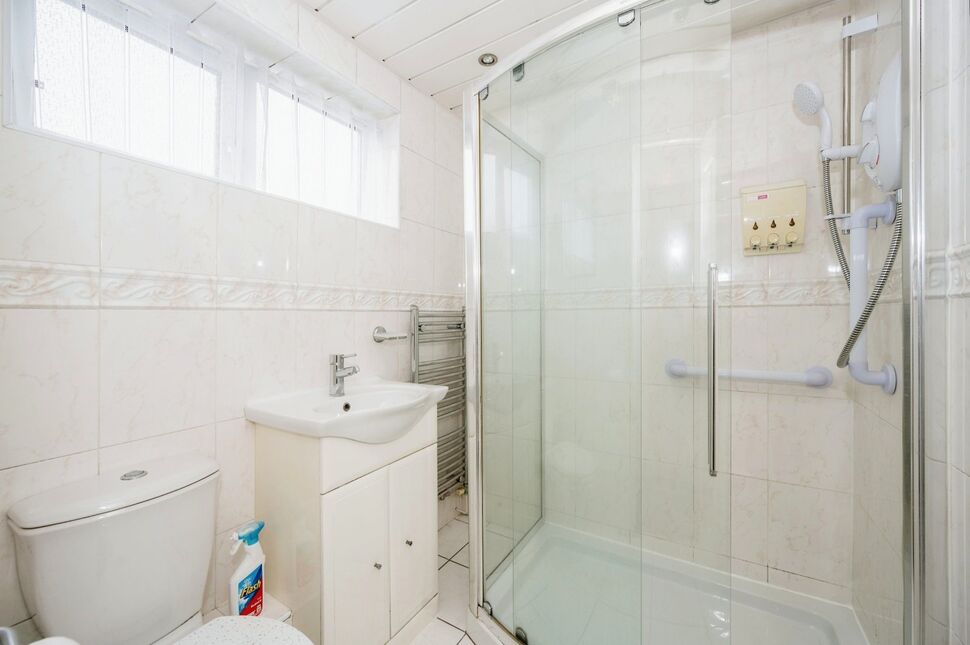 Fitted with a three-piece suite comprising of double shower enclosure, w/c and vanity wash hand basin with storage cupboard under. Ceiling spotlights. Window to the side of the property. Tiled walls. Heated Towel Rail. Tiled flooring.