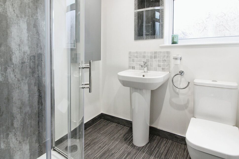 A fantastic shower room, newly fitted and comprises of a low level WC, a pedestal wash basin with a chrome effect mixer tap inset and a shower cubicle with a chrome effect mains shower with rain head attachment over. There is a vinyl floor which compliments the tiled splash backs, spotlights, an extractor fan, a heated towel rail and a window overlooking the rear aspect.