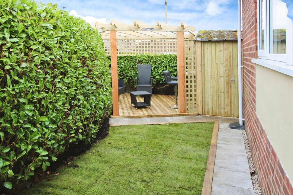 The front of the property is laid to lawn with beautiful shrubs and planted areas. A driveway leads to the side of the property accessed via double gates which has a seating area and leads to a detached garage. The rear garden is enclosed with new turf, mature shrubs and a wonderful Swedish decked patio area with pergola complete with a marble topped bar area.