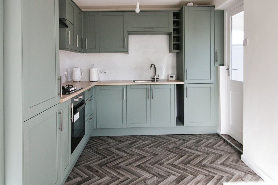A stunning space fitted with a range of wall, larder and base units, a roll edge work surface with easy wipe splash backs and a stainless steel sink with a chrome effect mixer tap inset. A stainless steel electric oven, gas hob with modern cooker hood over. Under cupboard lighting, a vinyl floor, a central heating radiator and a single glazed window with secondary glazing overlooks the front aspect.