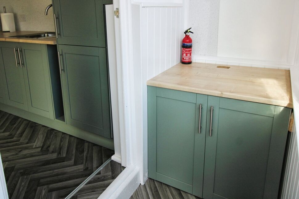 Fitted with base units and a roll edge work surface which match the kitchen, plumbing for a washing machine, space for a dryer and a single glazed door opens to the side aspect.
