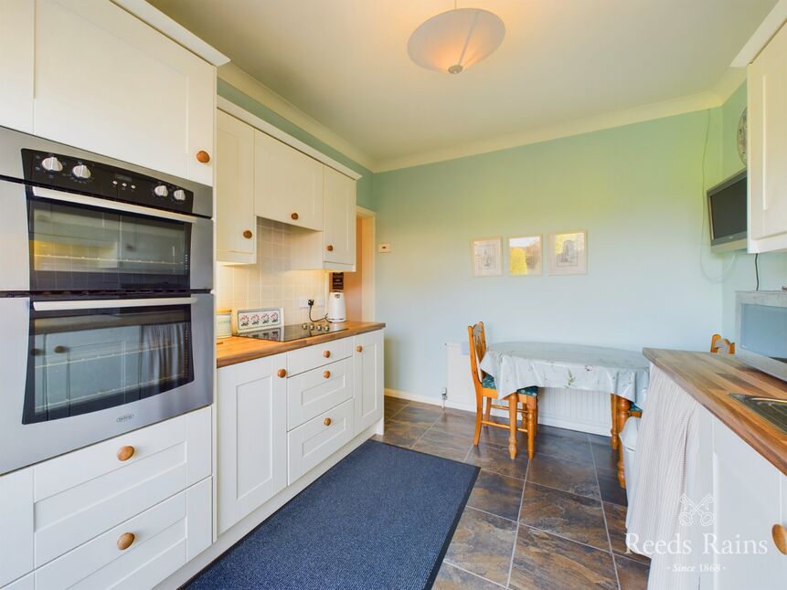 Overlooking the garden through stylish patio doors, the kitchen is a delightful space filled with natural light. Thoughtfully designed, it boasts a range of sleek base and wall units, ample drawers, and generous work surfaces. A sink with a tap and splashbacks completes the look. With plenty of room for appliances and a cosy dining area, it's the perfect spot for everyday meals and entertaining alike!
