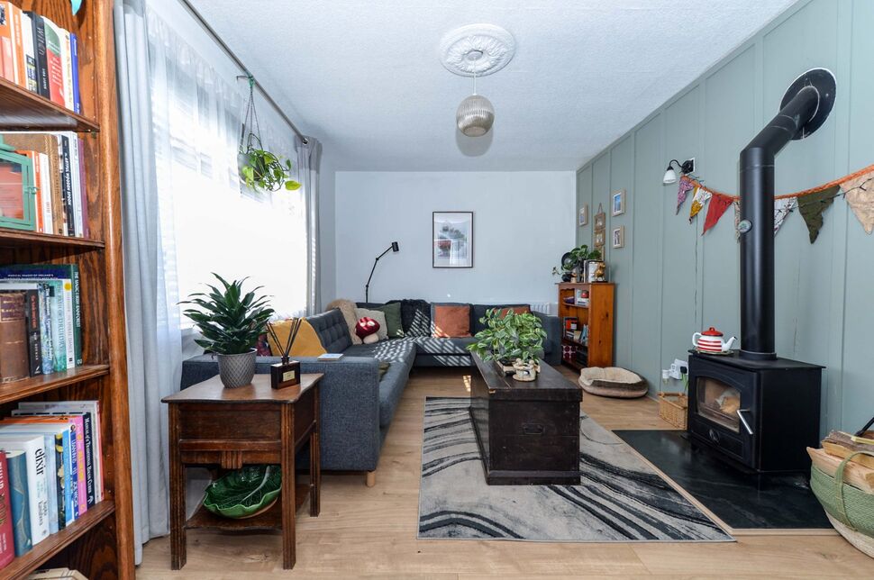 Laminate floor. Wood burning stove with slate hearth. Feature wall panelling.