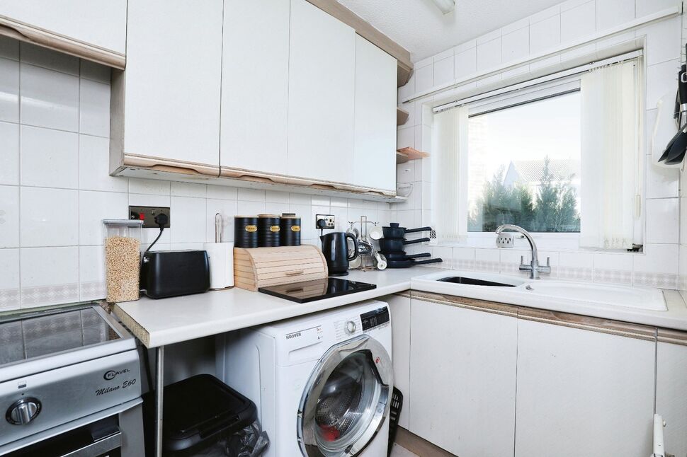 Briefly comprising; a range of matching eye level and base units, sink and drainer with mixer tap, free standing cooker, fully tiled wall, tiled flooring, central heating radiator, space for a washing machine and front facing double glazed window with fitted blinds.