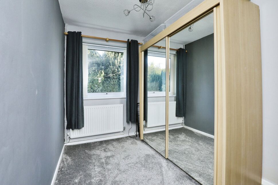 Fitted carpet, central heating radiator, fitted wardrobes and rear facing double glazed window with fitted blinds.