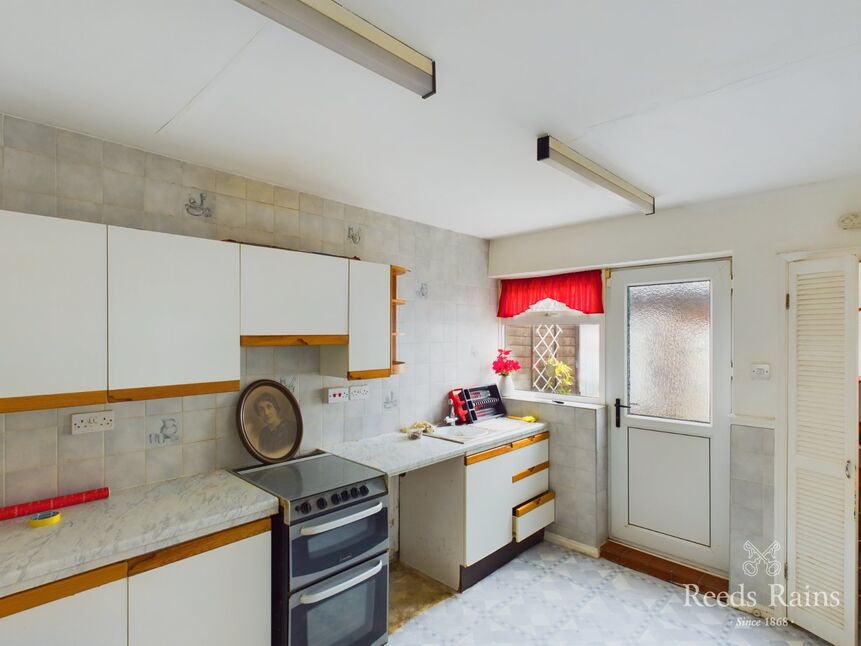 Cupboard houses gas central heating boiler. Door leads out to the rear garden.