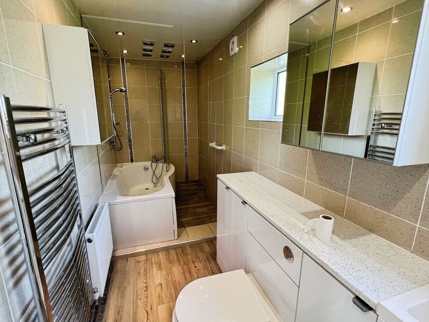 A modern white three piece suite comprising low level WC and wash hand basin set within vanity units. Panelled bath with shower above and glazed screen. The room is finished with neutral tiling, spotlights to the ceiling and central heating radiator. Upvc double glazed window.